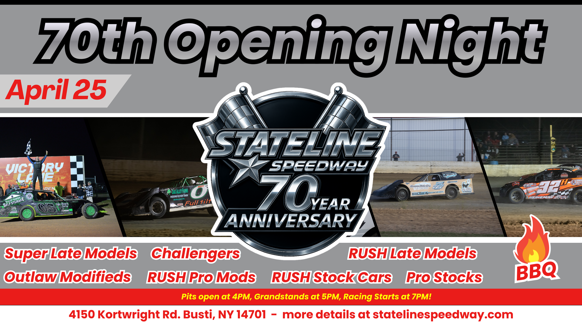 The green flag drops on Stateline Speedway’s 70th Anniversary Season with the official kickoff event of 2026 — 70th Opening Night. Come see the first laps on the newly clayed racing surface, check out the offseason improvements, and feel the energy of opening night as our weekly stars and regional standouts go to battle across Super 7 Racing.