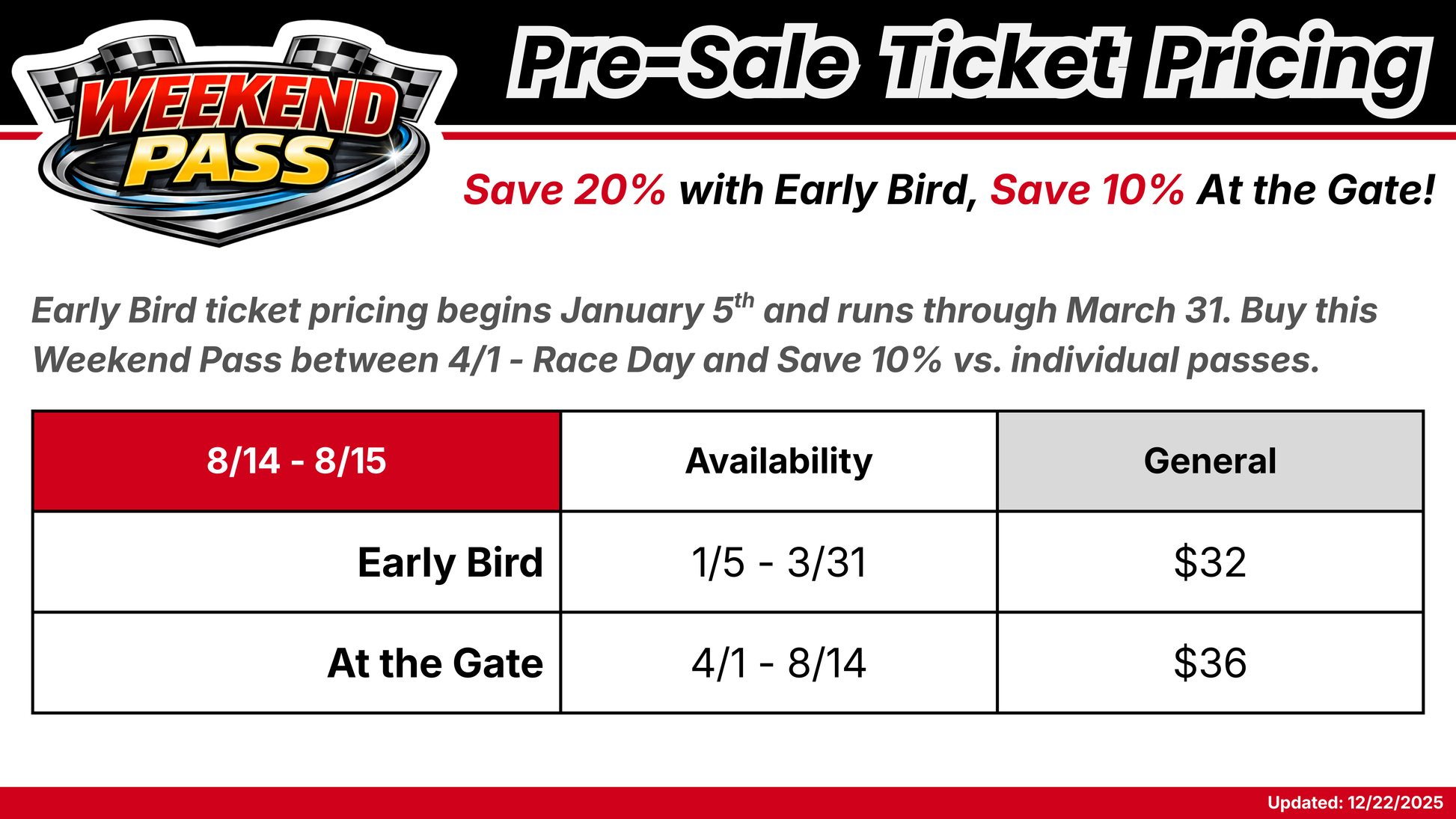 Make it a full throwback weekend at Stateline Speedway. The Vintage Rumble Weekend Pass gets you into both nights of one of the most unique events of the season—where racing history comes alive with vintage iron on the clay, packed pits, classic sights and sounds, and a weekend-long atmosphere you can’t replicate on a normal race night.